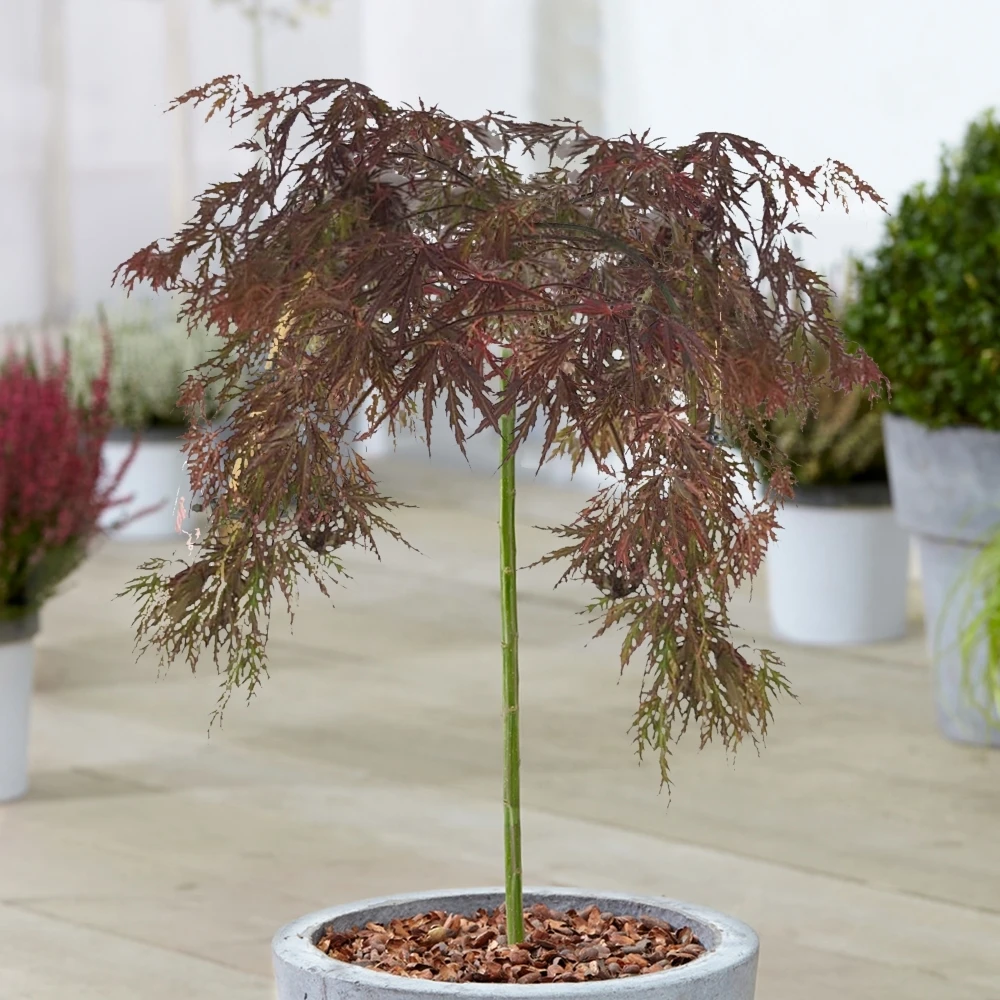 Acer palm palmatum ‘Inaba-shidare’ is a deciduous ornamental tree, with beautiful arching branches and widely spaced purple leaves which turn a vibrant crimson red colour in Autumn. Due to their sturdy ‘lollipop’ single straight stem, this acer tree is Ideal to situate in small gardens, patios, flower borders and beds! These weeping trees will thrive in partial shade or full sun – make sure to water regularly during the warmer months.