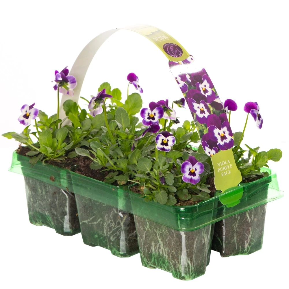 This 6 pack of Viola Purple Face bedding plants have an abundance of colour that evenly fills the flowers with eye-catching shades. From the centre of the plant, a yellow bud is present, with deep purple and white dispersing out from there. These distinct features of its design is finished off when the deep purple shade returns once more on the outer section of each petal. They will easily standout in flower beds and plant displays, especially after they begin flourishing in early Spring through to early Autumn. They can be planted straight from the tray upon arrival and will thrive with ease when given the correct care.