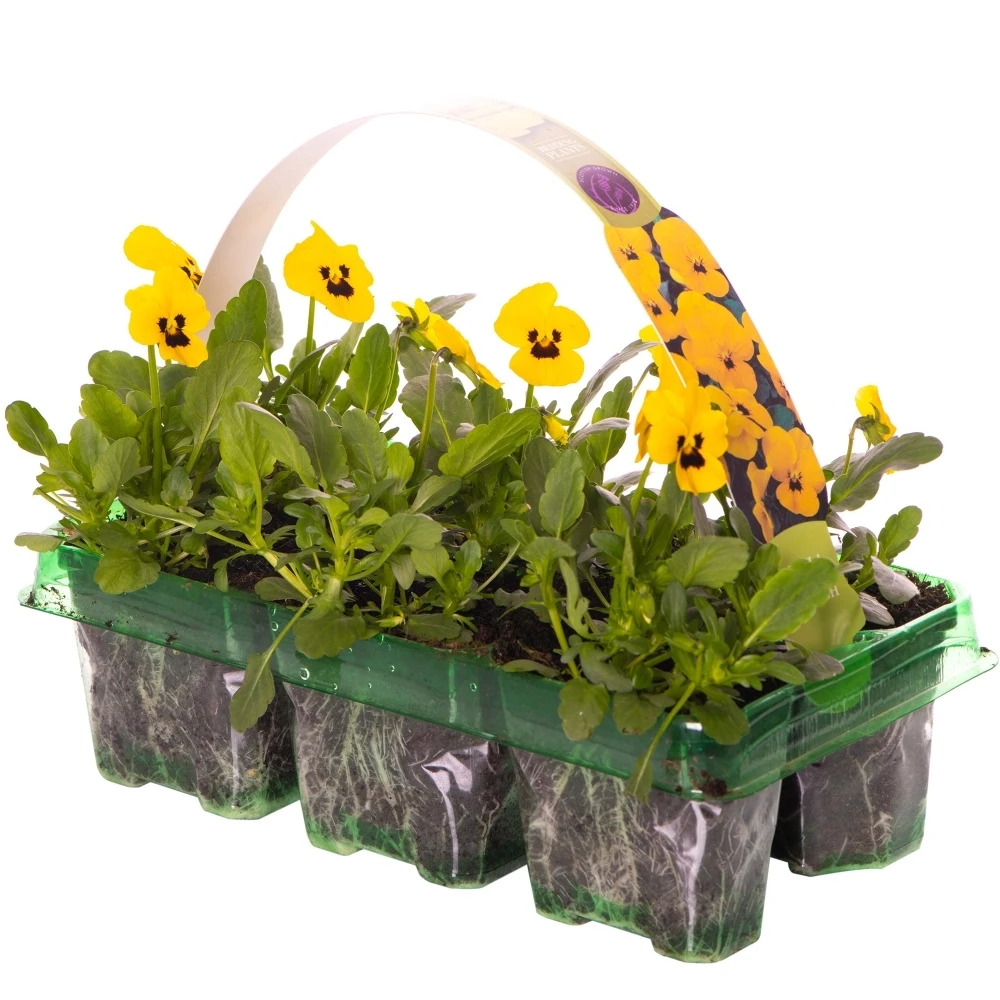 This 6 pack of Viola Yellow Blotch bedding plants features a bright yellow colour throughout their petals. The plant also bears a dark blotch in the centre of each flower, adding a subtle contrast between light and dark shades. The lush, green foliage is very clean and fresh, allowing the plants brighter features to show off in flower beds or plant displays to great effect. They will begin blooming in Spring, carrying that through to Autumn, with the po6tial to flower in Winter due to their impressive hardiness. They can be planted straight from the tray upon arrival, flourishing with ease when given the correct care.
