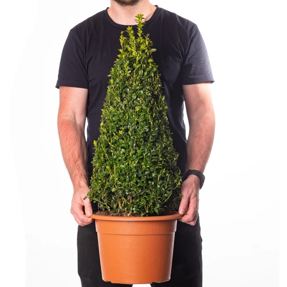 Boasting dense foliage of small glossy green leaves, Buxus is extremely well suited for topiary and is happy to be trimmed to your heartโs content. It is slow growing in nature, which makes maintaining the elegant cone shape nice and easy. Turning the pot around occasionally will allow the sun to reach every part of the plant and encourage even growth.