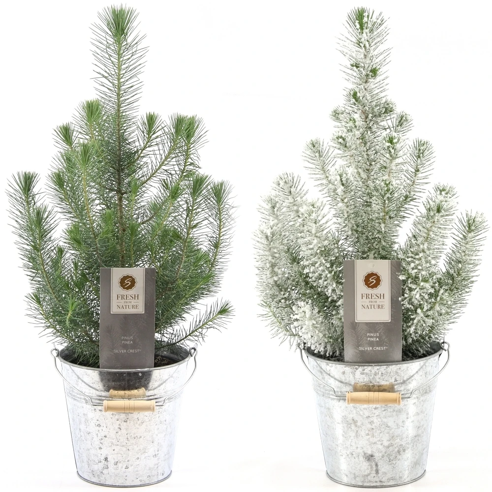 Celebrate the holidays and bring a festive cheer to any size space with the small, potted ornamental Christmas pine tree, pot grown in a weathered-look zinc pot for an extra rustic feel.