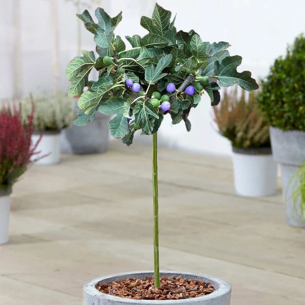 Ficus ‘Brown Turkey’ ornamental trees present nutritious figs which can grow up to 10cm in length – at first green, then purple when ripe. These trees are perfect to situate in vibrant borders, patios or small gardens. Optimum height and spread will vary, but generally can reach up to 300cm.