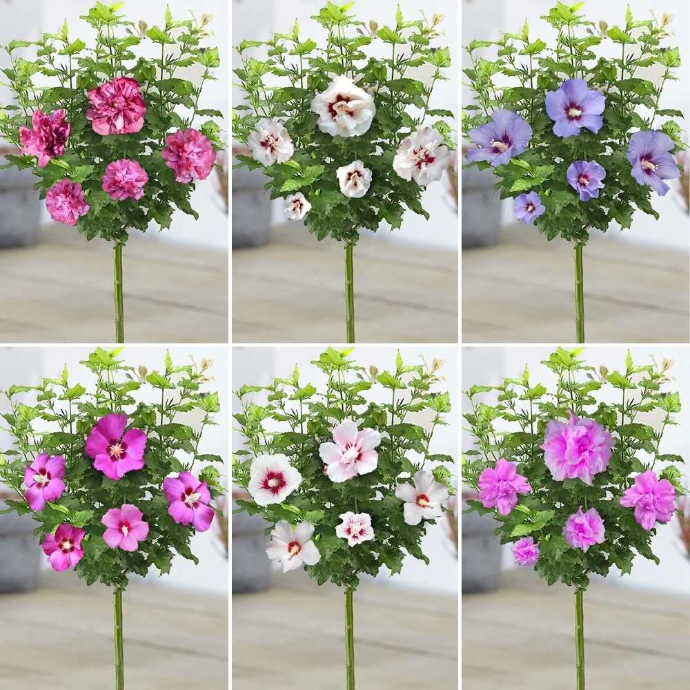 Add a delightful, ornamental piece into your garden with our Hibiscus Patio Trees. More commonly known as Rose of Sharon, these deciduous trees produce upright, three-lobed, green coloured foliage. They will tend to flourish from Summer through to Autumn, bringing wonderful bursts of colour to any sunny spot of the garden you wish to place them in.Â