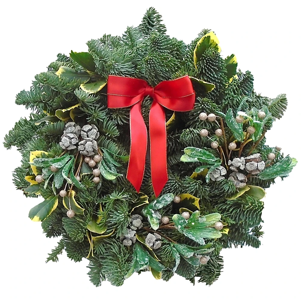 A base of aromatic Noble Fir foliage is accompanied by holly and mistletoe for the ultimate display of festive foliage. A touch of snowy sparkle brings everything together along with a gorgeous red bow.