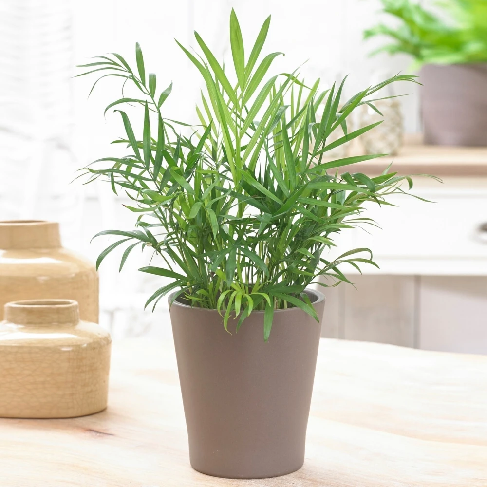 The Palmour Palm, also known as Neanthe Bella Palm, is a popular houseplant. This indoor palm comes in a variety of sizes – the tallest we have reaches a manageable 70-80cm! Its arching, bright green stems bear an abundance of vibrant foliage that can form up to 40 unique leaflets. Small, bright yellow flowering is also possible, requiring the plant is mature and is given sufficient light levels in your home or office.