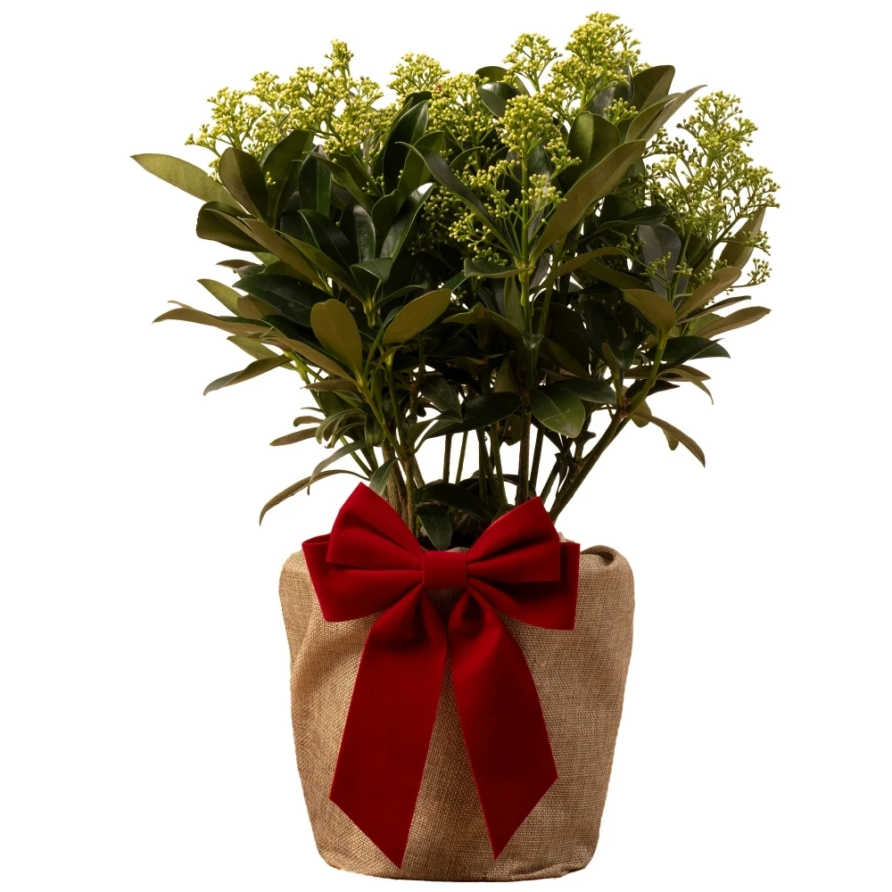 This Skimmia Finchy is a beautifully bushy plant with creamy white flowers that bloom in abundance during Spring. Complete with a gift bag and seasonal red bow, this plant would make a beautiful Christmas gift for the plant lover in your life to enjoy long after the season has passed. Position the Skimmia in areas receiving partial shade, shielding it from the harshness of direct sunlight. A well-drained, consistently moist soil is key to its thriving, necessitating regular watering, especially during the drier phases of its inaugural growth year.