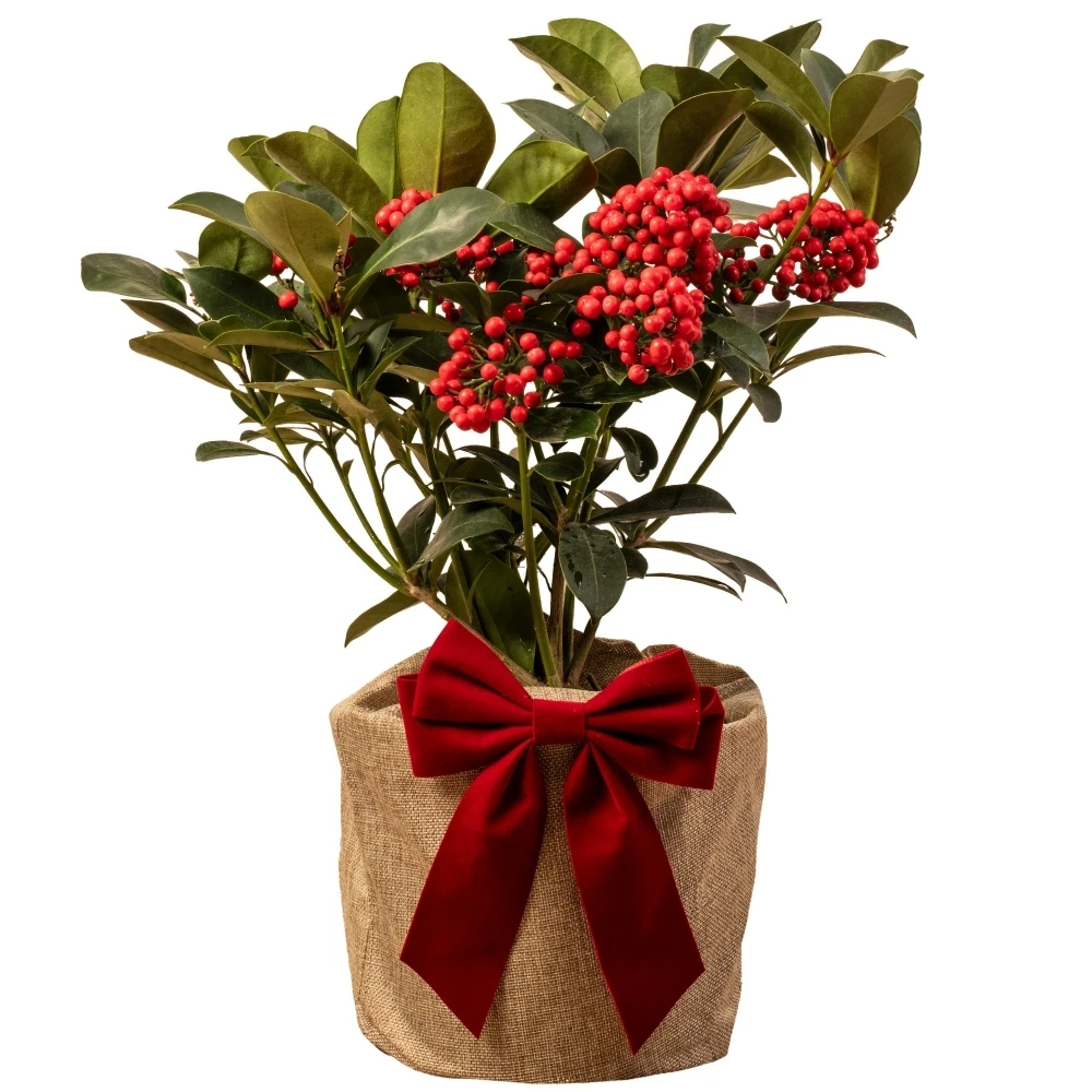 This Skimmia Redruth is a beautiful, bushy evergreen plant that brings together all the colours of Christmas. Glossy, green foliage and red berries are complemented by white, scented Spring flowering. The perfect Christmas gift, complete with rustic gift bag and stylish bow that flourishes all year long, Position the Skimmia in areas receiving partial shade, shielding it from the harshness of direct sunlight. A well-drained, consistently moist soil is key to its thriving, necessitating regular watering, especially during the drier phases of its inaugural growth year.
